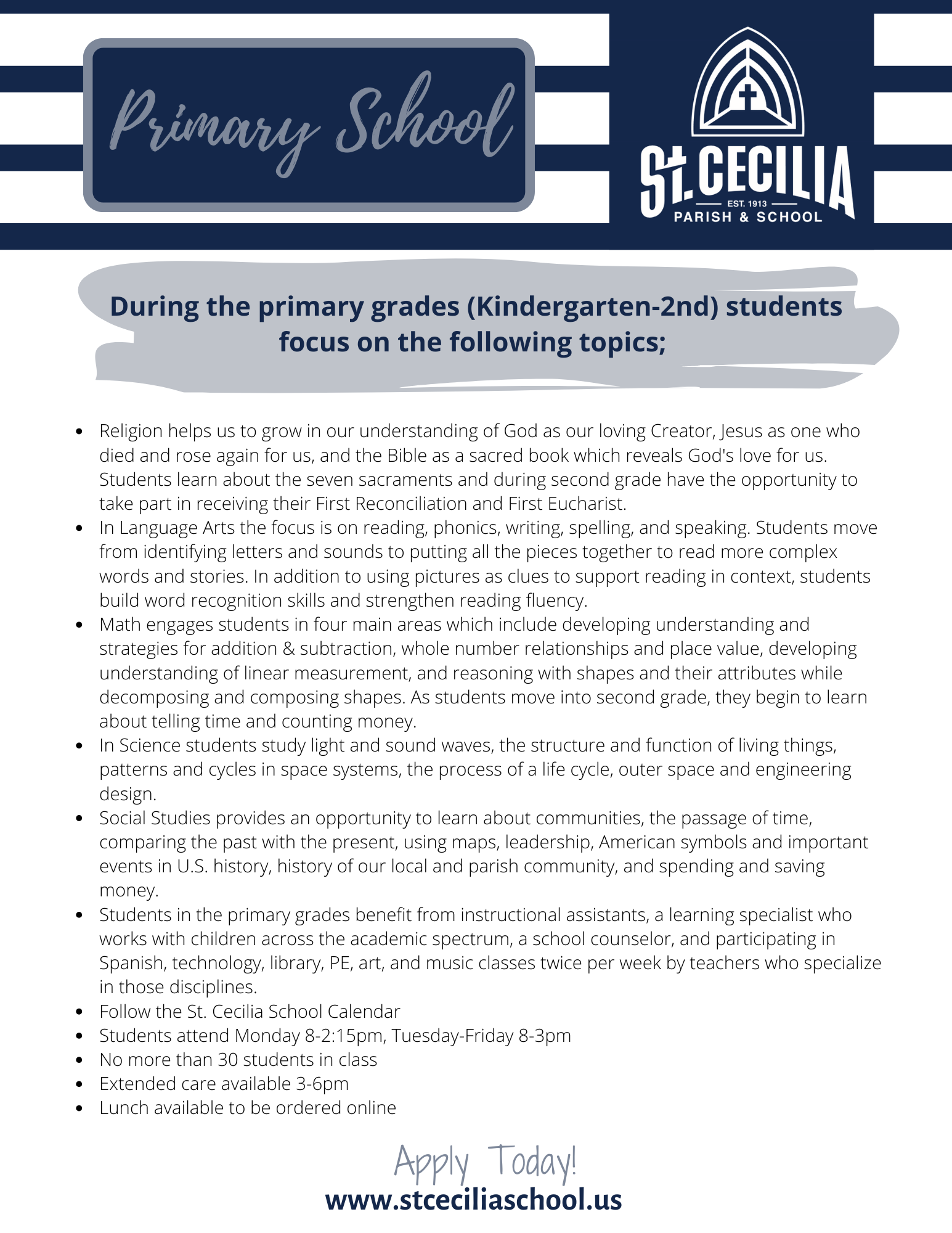 Religion helps us to grow in our understanding of God as our loving Creator, Jesus as one who died and rose again for us, and the Bible as a sacred book which reveals God's love for us. Students learn about the seven sacraments and during second grade have the opportunity to take part in receiving their First Reconciliation and First Eucharist.