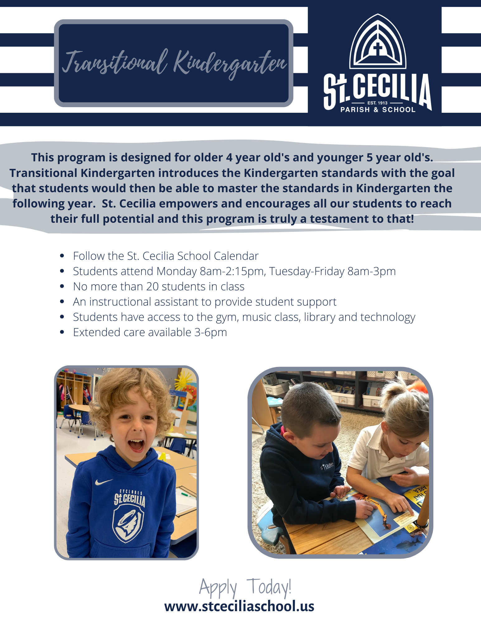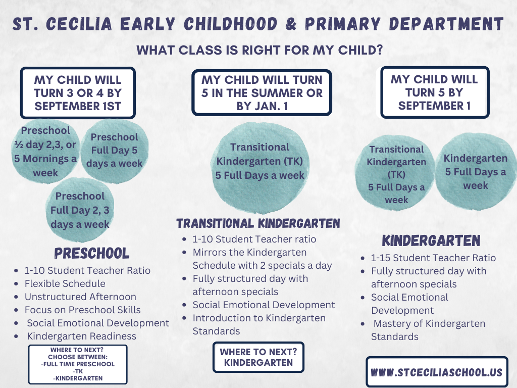 This program is designed for students that are eligible for kindergarten next fall, however might be very young for their grade level AND for 4-year olds that are eligible for kindergarten in the following fall and would be older for their grade level (turning five early in the school year-birthday of Sept-Dec). Transitional Kindergarten introduces the Kindergarten standards with the goal that students would then be able to master the standards in Kindergarten the following school year. St. Cecilia School empowers and encourages all our students to reach their full potential and this program is truly a testament to that.